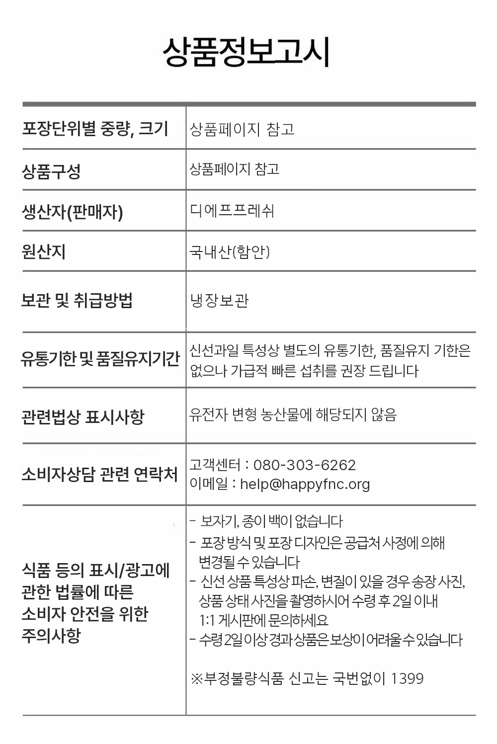 · 주의사항 - 일요일, 법정공휴일은 배송(도착)하지 않습니다. (명절 및 특수시즌 제외) - 배송지 정보와 받으시는 분의 장소 및 연락처가 불분명할 경우에는 배송이 지연될 수 있으며, 그로 인한 상품 변질에 대해서는 자연이랑이 책임지지 않습니다. |