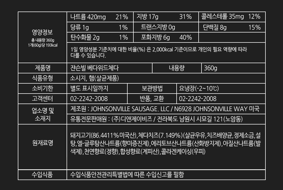 [쟌슨빌] 냉장 소시지 베다체다 360g