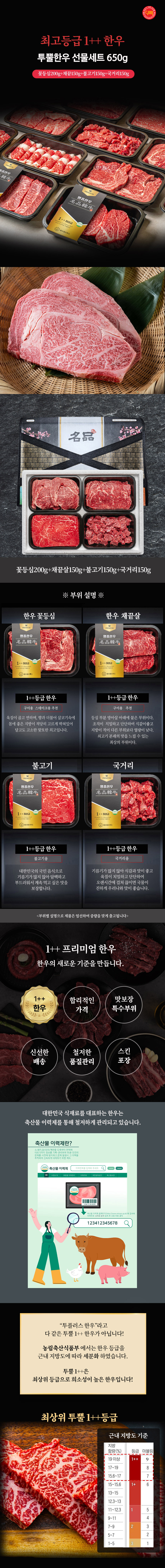 | 판매단위 | 한우1++ 650g (꽃등심200g+채끝150g+불고기150g+국거리150g) | |