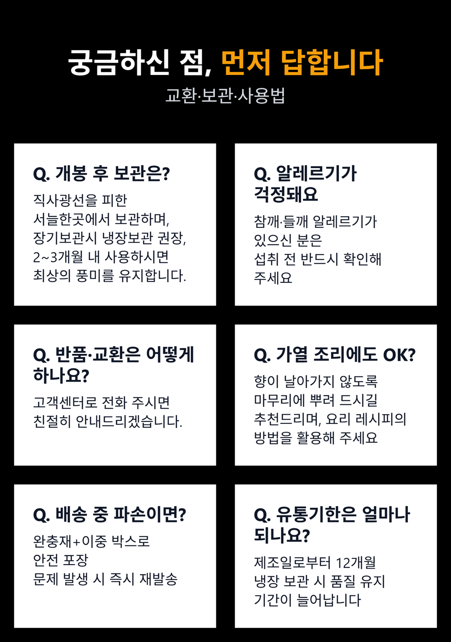 · 주의사항 - 일요일, 법정공휴일은 배송(도착)하지 않습니다. (명절 및 특수시즌 제외) - 배송지 정보와 받으시는 분의 장소 및 연락처가 불분명할 경우에는 배송이 지연될 수 있으며, 그로 인한 상품 변질에 대해서는 자연이랑이 책임지지 않습니다. |