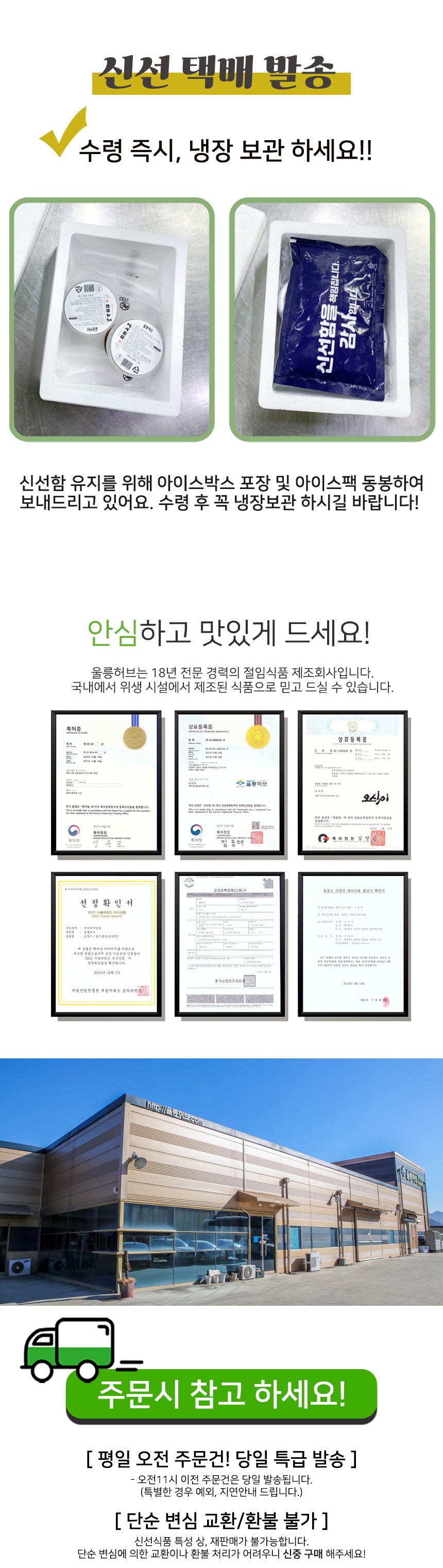 · 주의사항 - 일요일, 법정공휴일은 배송(도착)하지 않습니다. (명절 및 특수시즌 제외) - 배송지 정보와 받으시는 분의 장소 및 연락처가 불분명할 경우에는 배송이 지연될 수 있으며, 그로 인한 상품 변질에 대해서는 자연이랑이 책임지지 않습니다. |