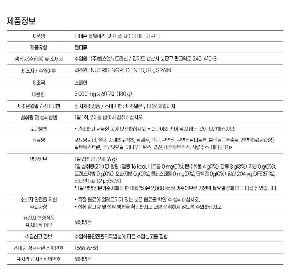 | 판매단위 | 180g(3.0g x 60 구미) 2병 |