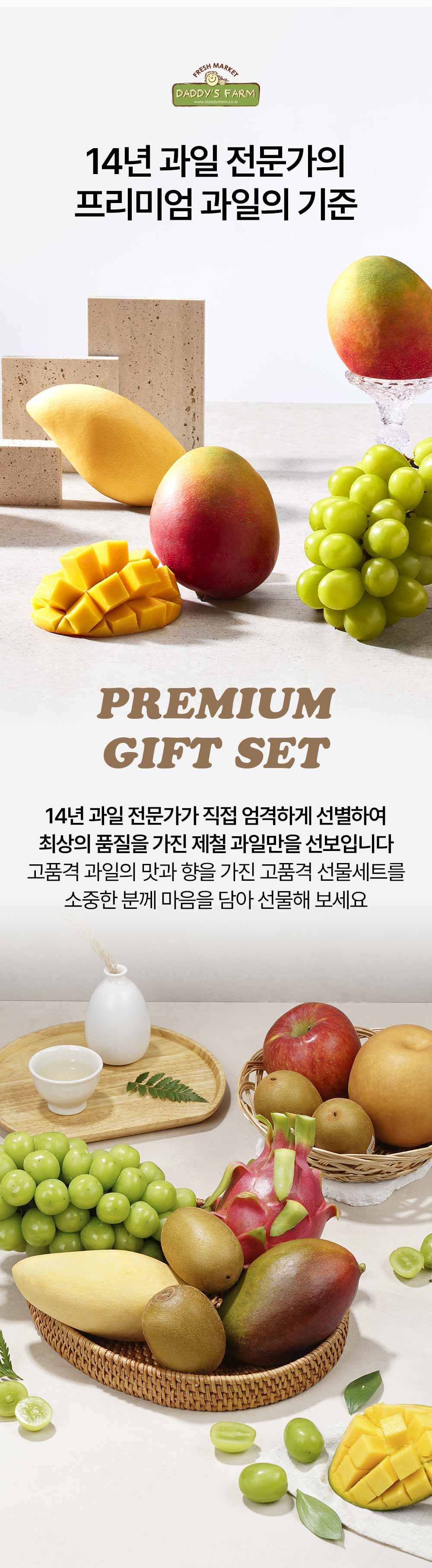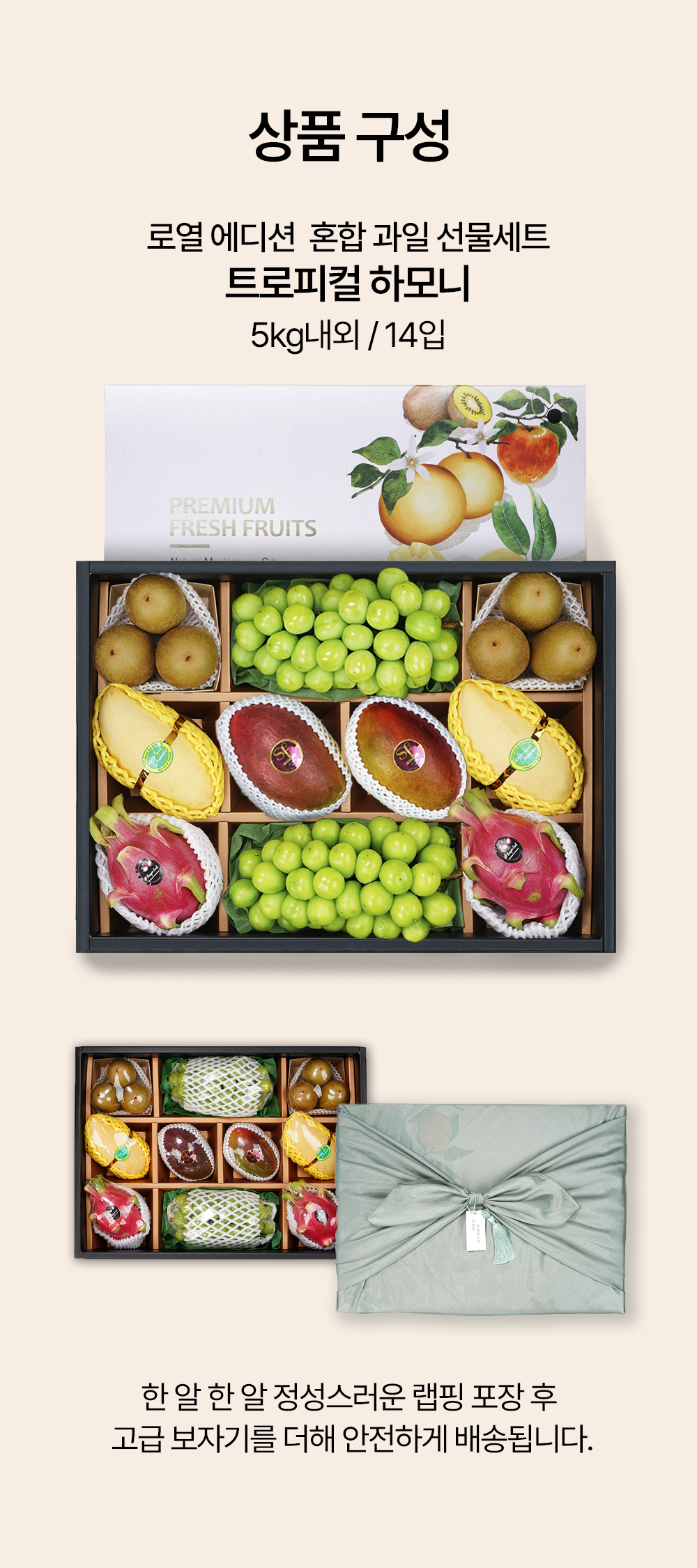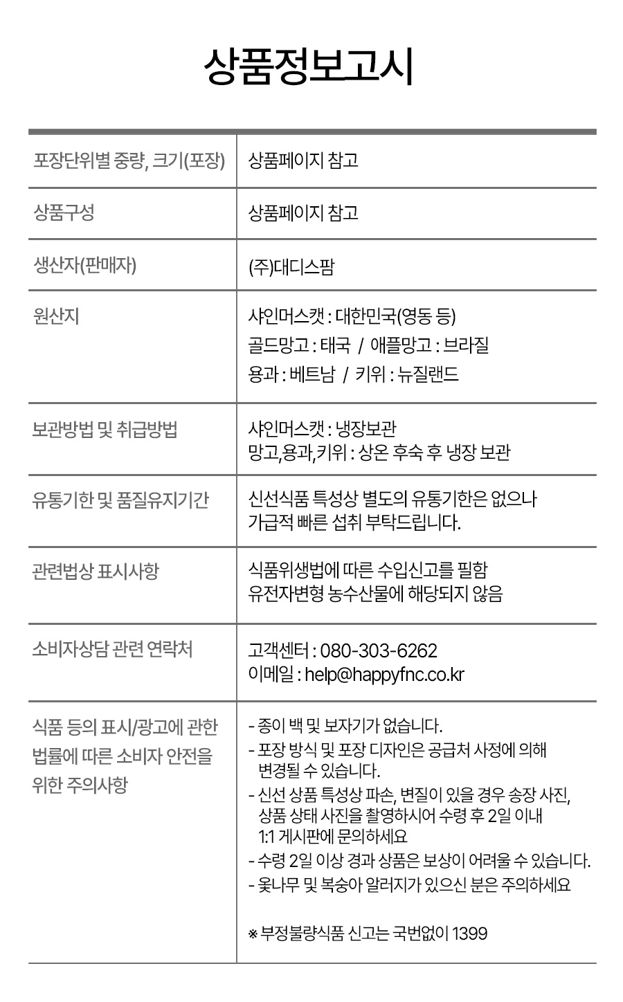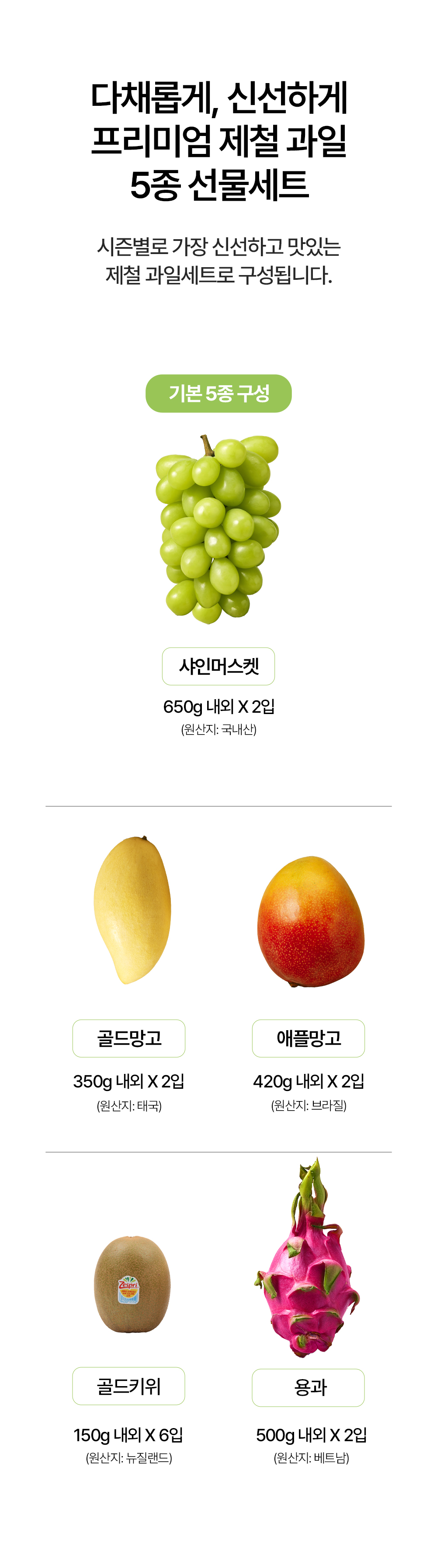 | 판매단위 | 5kg내외[샤인머스캣 2수(1과/650g내외), 골드망고 2입(1과/350g내외), 애플망고 2입(1과/420g내외), 용과 |
