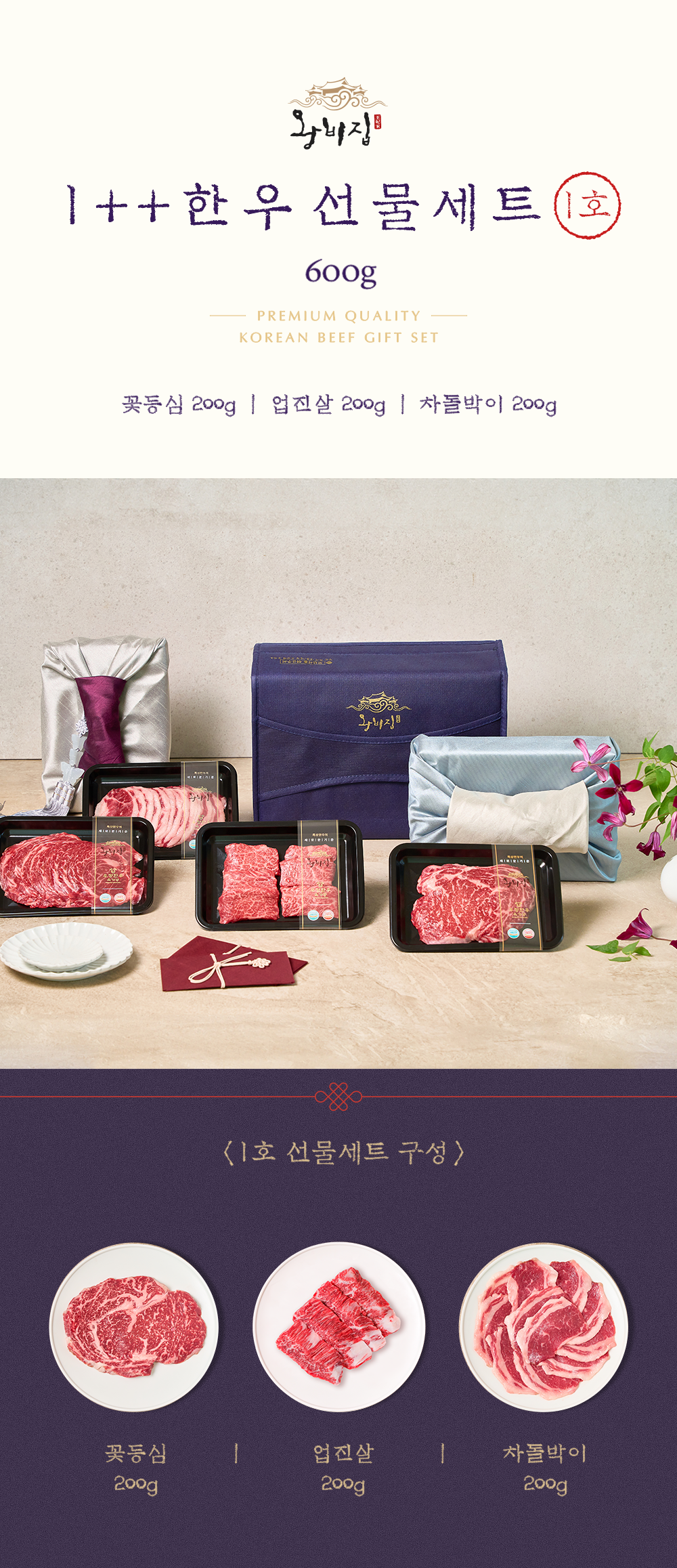 [왕비집] 1++ 한우 선물세트 1호(꽃등심/업진살/차돌박이각200g)