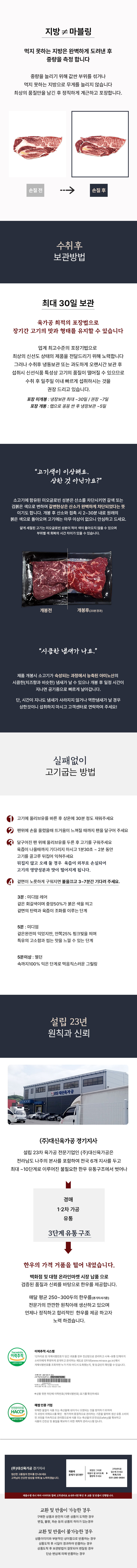 <신선 축산 스킨 포장 안내> 진공 스킨 포장으로 보내드리는 상품입니다. 진공 포장 시 고기 숙성과정에서 발생하는 아미노산(가스발생)의 응집에 의해 개봉 시 일시적으로 이취가 발생 할 수 있습니다. 개봉 후 잠시 상온에 두거나, 핏기를 닦아내면 이내 사라집니다. 외부 산소 차단에 의해 발생한 현상으로 고기에 이상이 있는 것이 아니니 안심하고 섭취하셔도 됩니다. ![]() ![]() ![]() ![]()