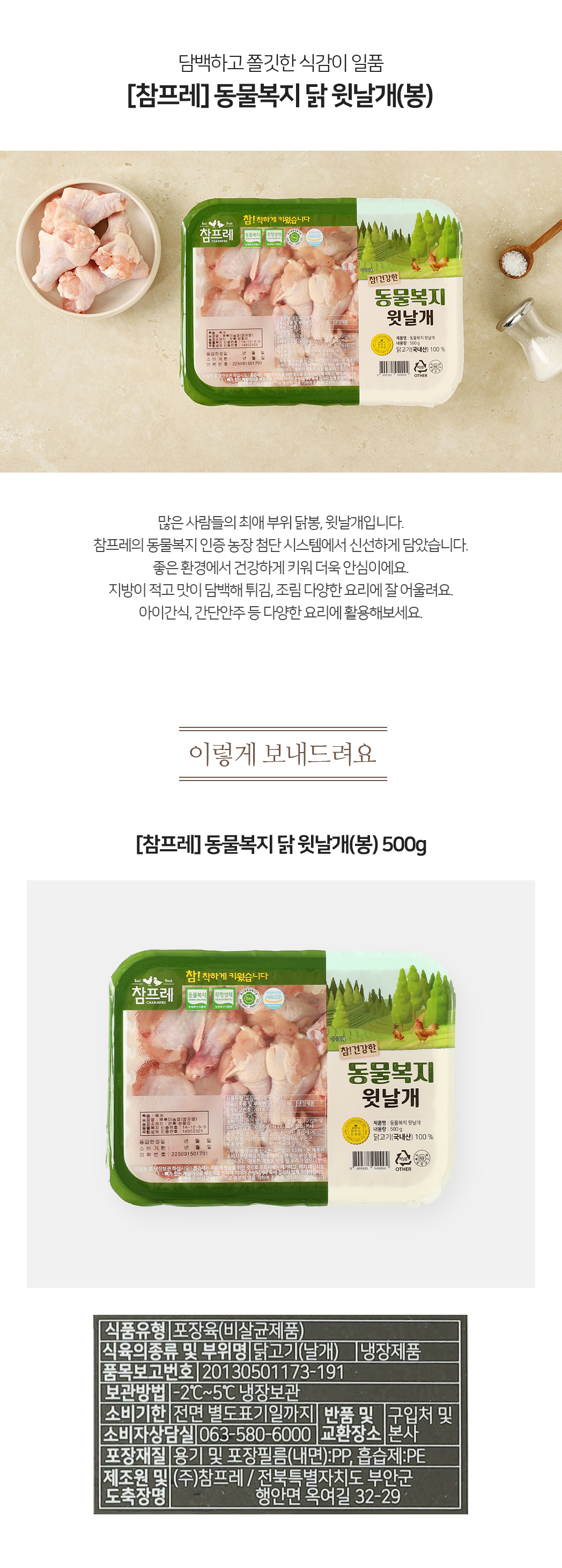 품목또는명칭 [참프레] 동물복지 닭 윗날개(봉) 500g(냉장)