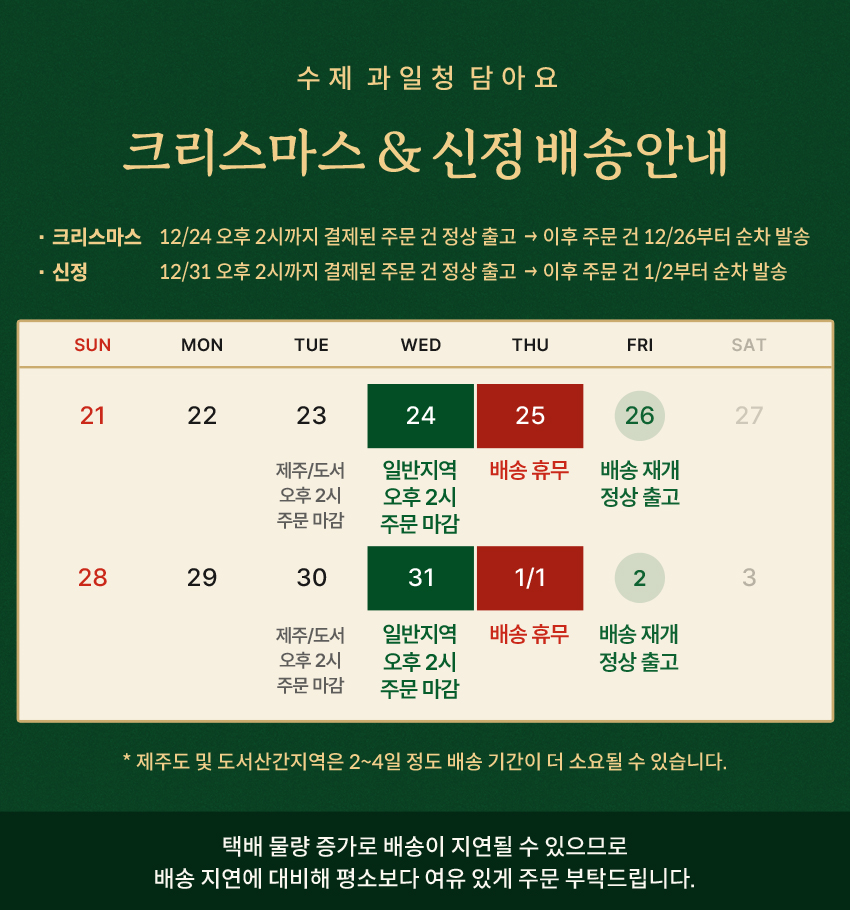 · 공휴일 전날은 출고 불가하며 당일 출고건은 다음날 배송됩니다.