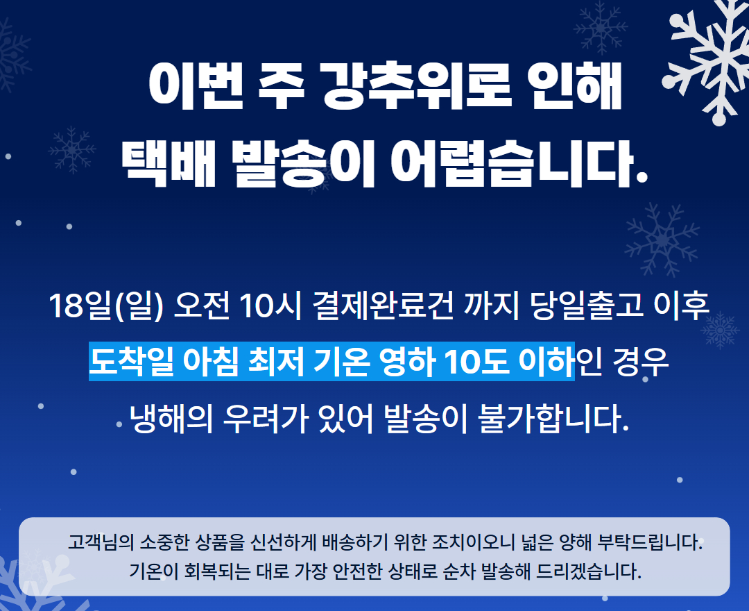 - 주말 주문량이 많을 경우 월요일 주문이 하루 지연 발송 될 수 있습니다.