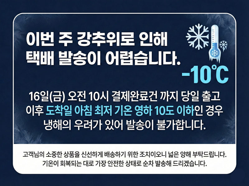 - 물류센터 출고 시, 수취인에게 문자로 안내 드리며, 통신사 상황에 따라 지연, 누락 발송 될 수 있습니다.