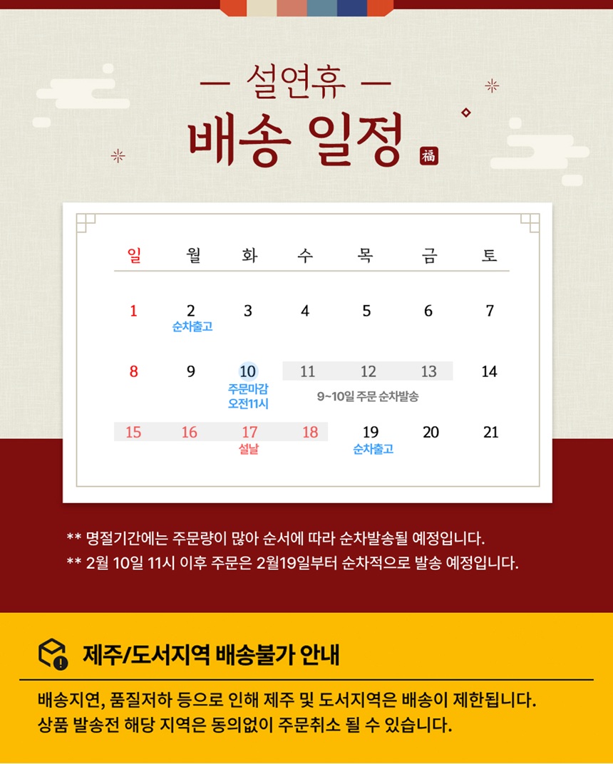 - 일요일, 법정공휴일은 배송(도착)하지 않습니다.(명절 및 특수시즌 제외)